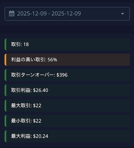 勝率56%でいつもより下振れしましたが、全18トレードで目標達成。