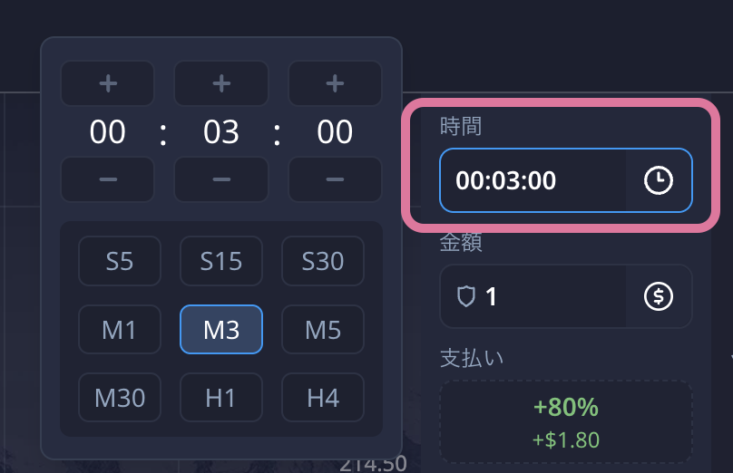 チャートはローソクの30秒足で、トレード時間は3分間(🕐:経過時間モード)。