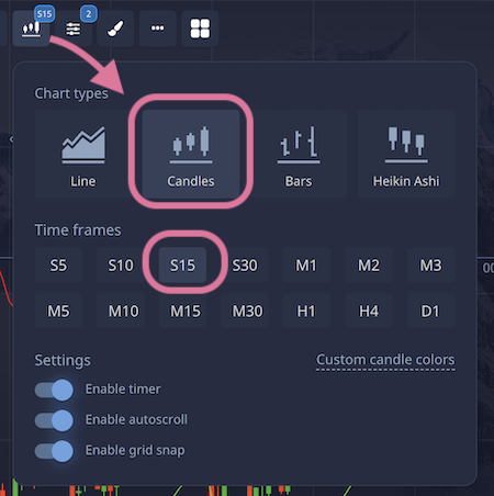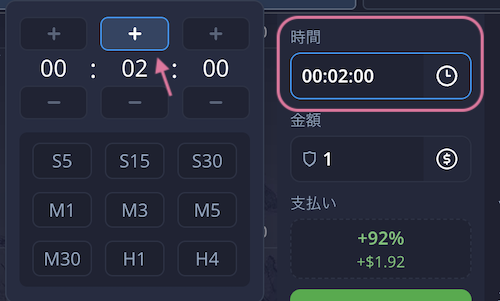 チャートはローソクの15秒足で、トレード時間は2分間(🕐:経過時間モード)。