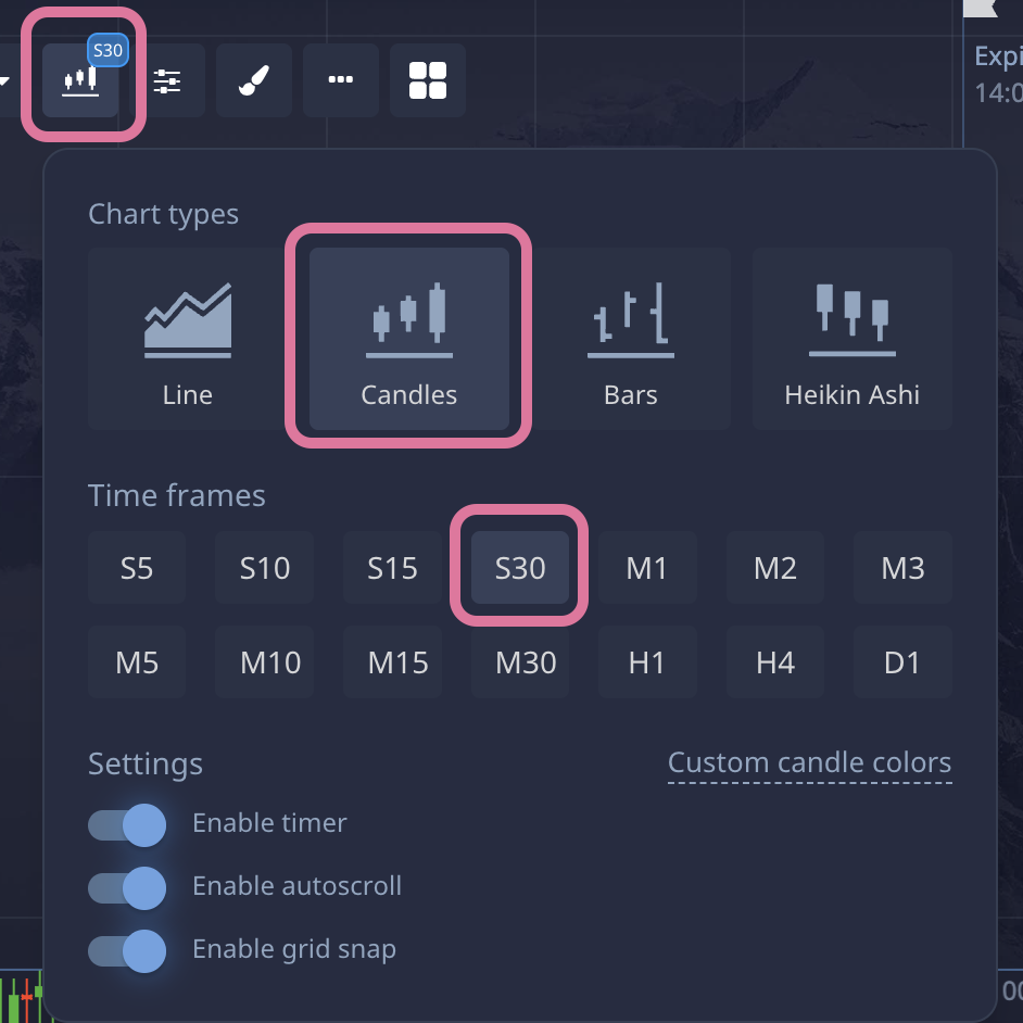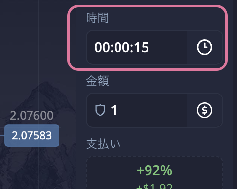 チャートはローソクの30秒足で、トレード時間は15秒間(🕐:経過時間モード)。