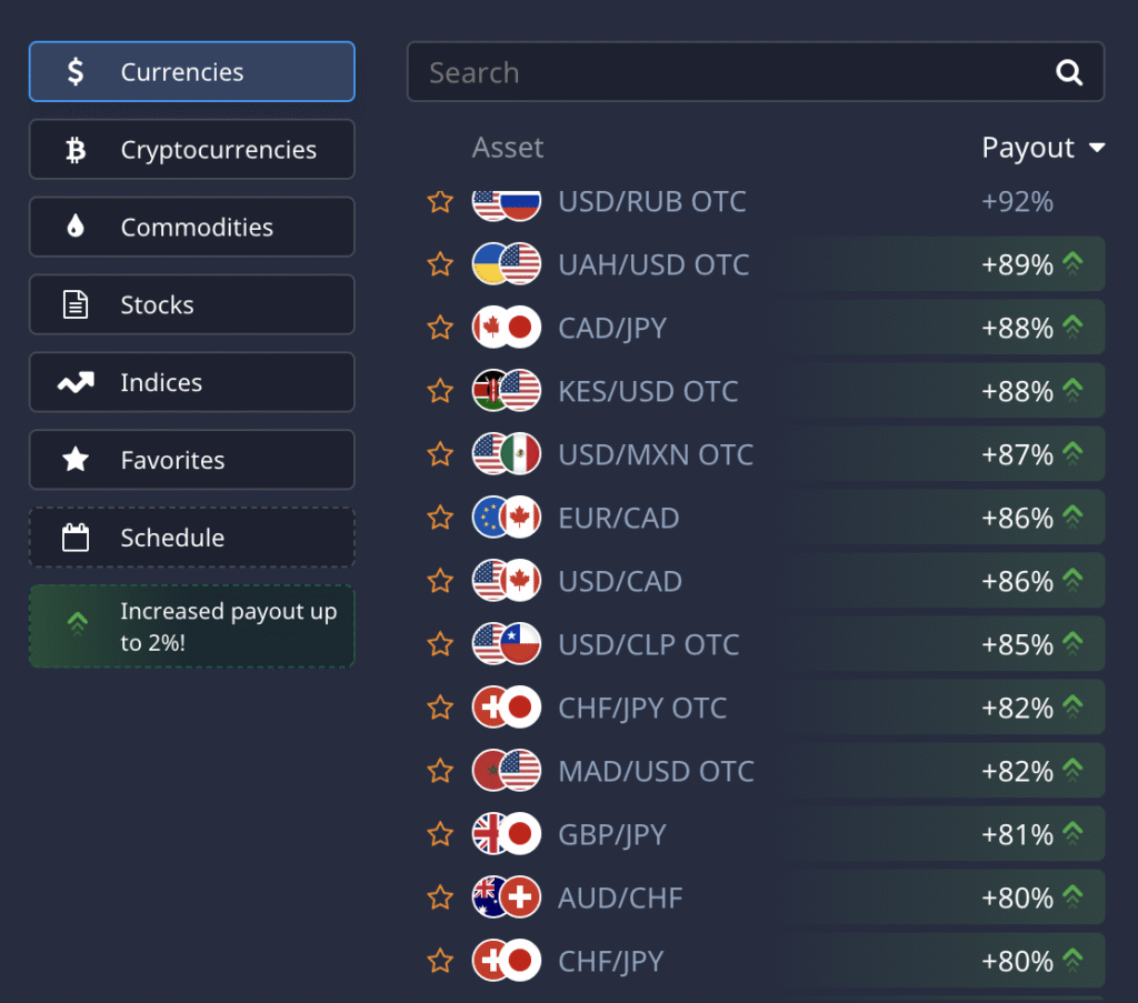 上の画像の様に、アセット一覧には”OTC”が付いているものと付いていないものが混在しているので、MT4/5やTrading Viewを使う際には必ずここで”OTCが付いていないもの”を選択する必要があります。